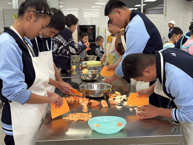 洗薯刮皮、切塊拌料、鋪料入箱……同學(xué)們圍站操作臺(tái)前,分工協(xié)作完成地瓜蘋果派的制作:有人細(xì)致削皮切塊,有人混合蛋液與食材,有人將餡料均勻鋪在烤盤上。